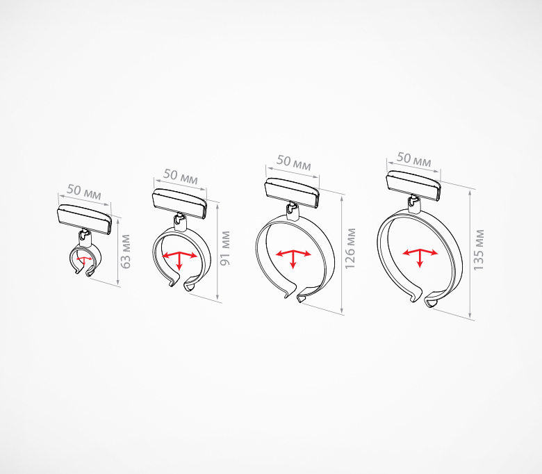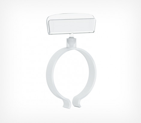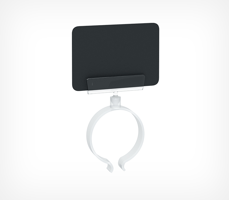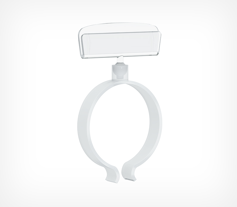 Ценникодержатель для колбасных изделий, копченых и мягких сыров, паштетов в палках. Надевается на изделие и столь же легко снимается, не повреждая его внешнего вида. Верхняя часть держателя шириной 50 мм позволяет размещать бумажные и ламинированные вставки. За счет шарнирного соединения можно менять их угол наклона. Диаметр нижней части крепления варьируется от 20-30 мм до 80-140 мм.