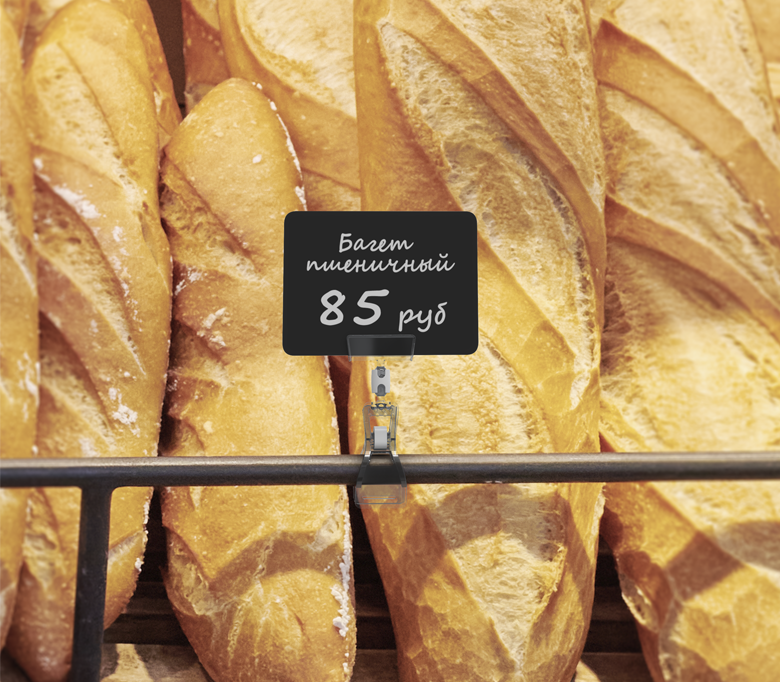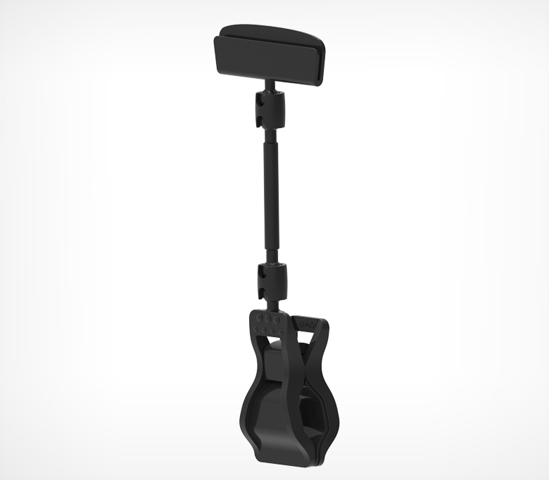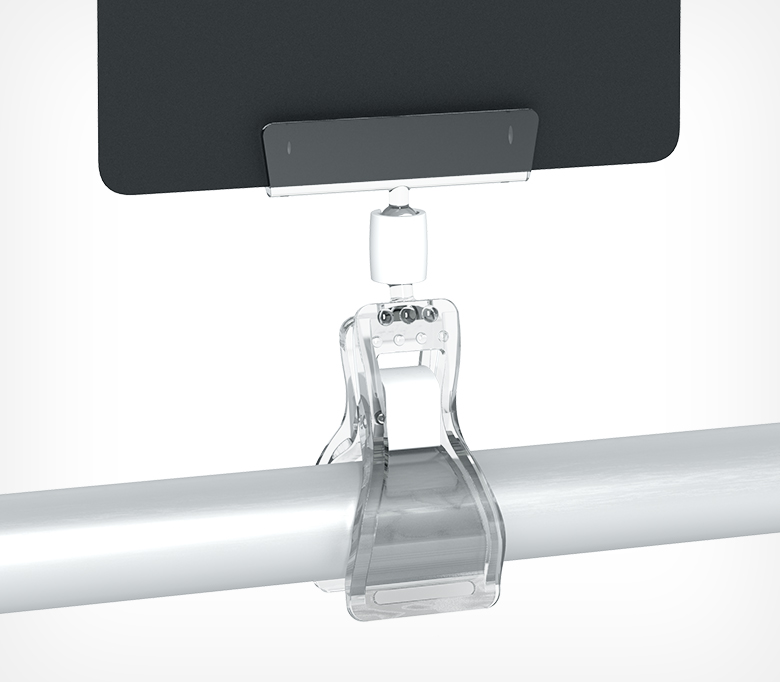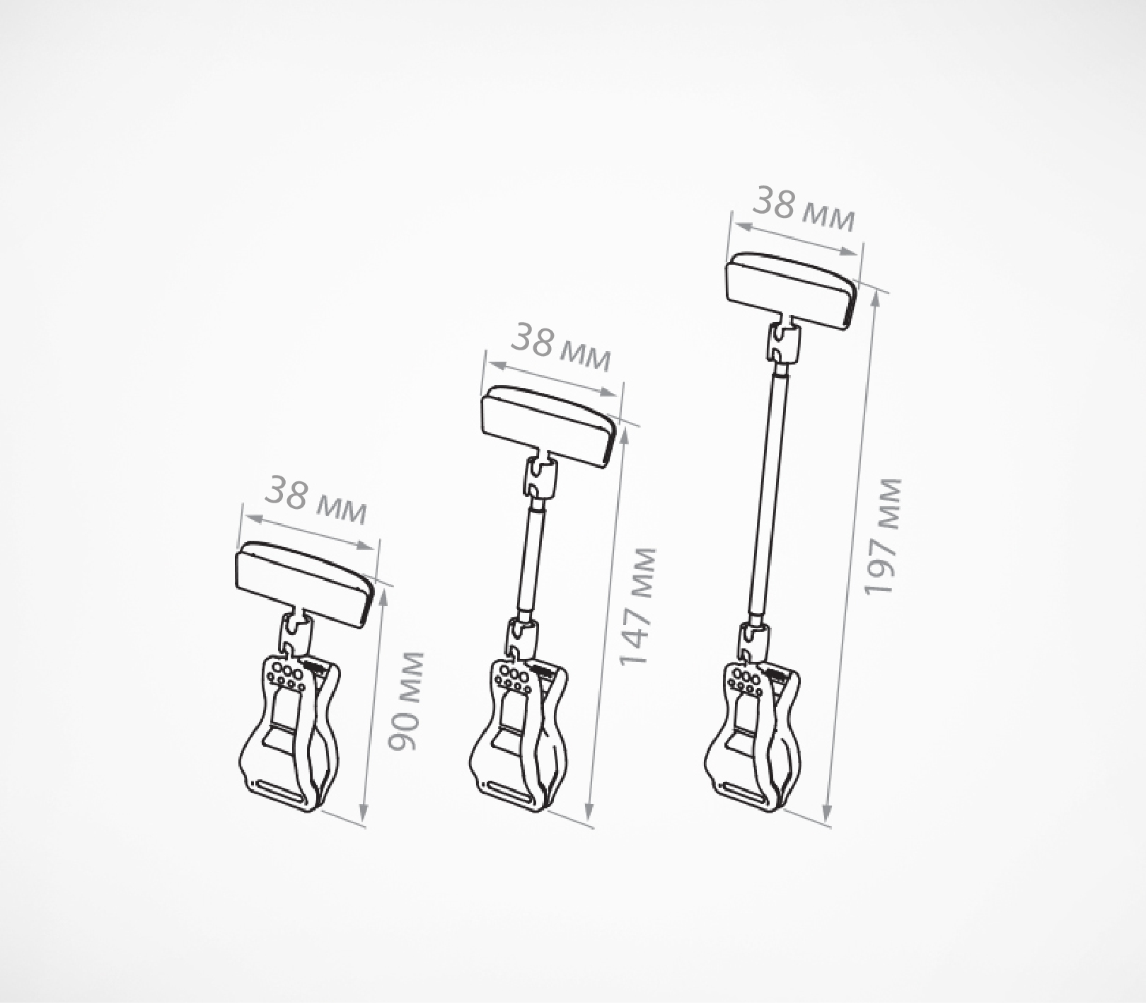 Пластиковый держатель шириной 38 мм на прищепке для фиксации ценников на трубу, гастроемкости, торцы стеллажей и распродажные корзины. При помощи зажимной части фиксируется на торец, край чего-либо толщиной до 25 мм, а также округлые конструкции, имеющие в диаметре до 32 мм. За счет установки удлинителей возможны три варианта длины изделия: без ножки, с ножкой 50 мм и 100 мм.