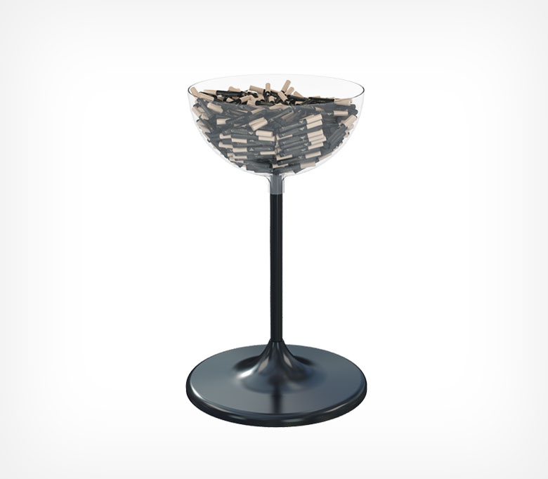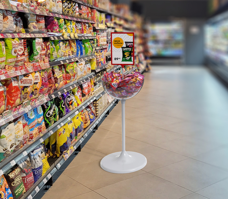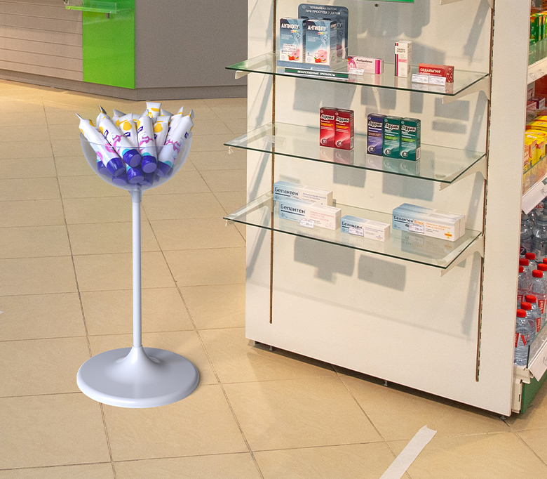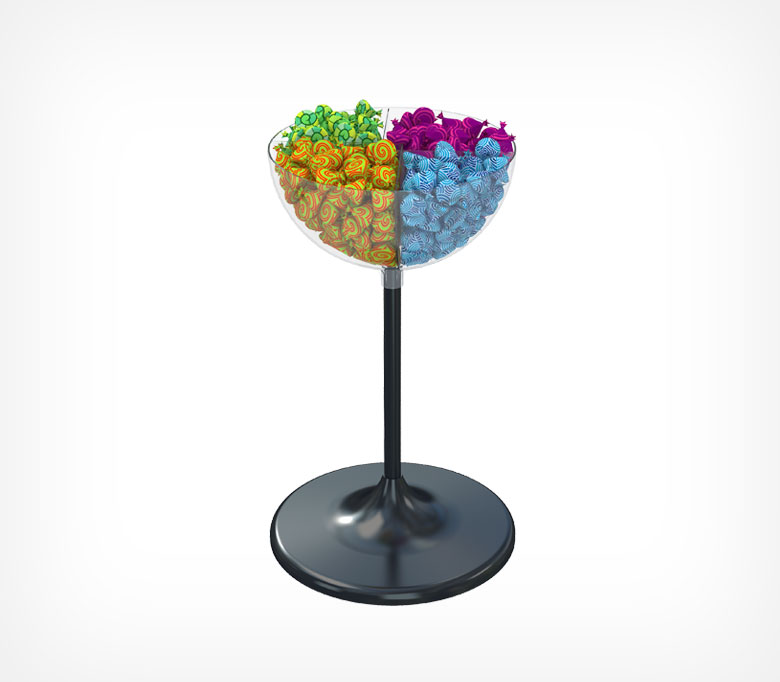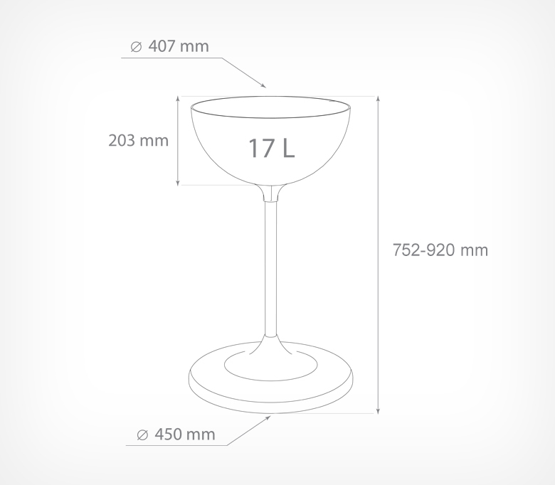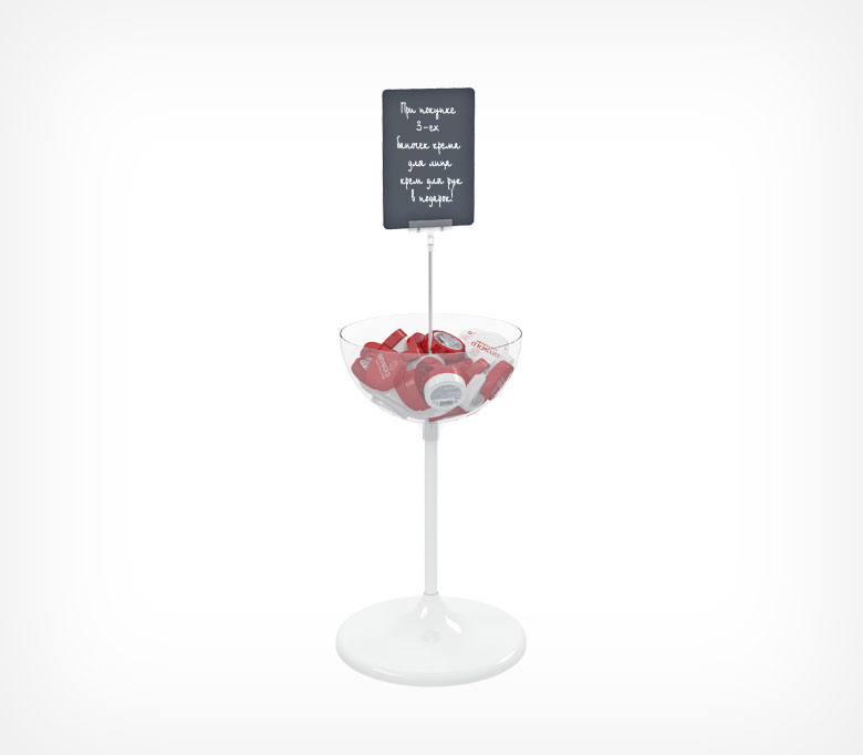 Дисплей состоит из прозрачной цельнолитой чаши (объем - 17 литров), металлической опорной ножки и пластикового основания.