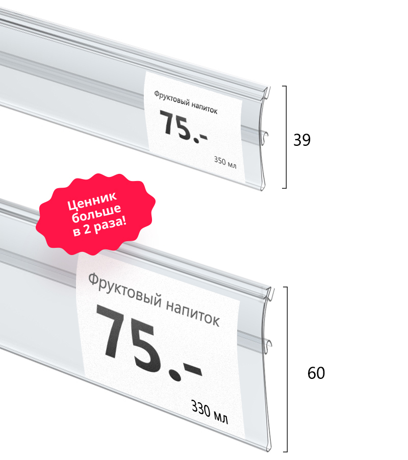 Исследования показывают: крупный ценник делает цену заметной и способствует росту продаж. Для того, чтобы наши клиенты могли повышать свои продажи, мы увеличили размер популярного ценникодержателя на профильные полки – HSAC. Теперь вы можете выбирать из двух размеров – стандартного 39 мм и увеличенного 60 мм.