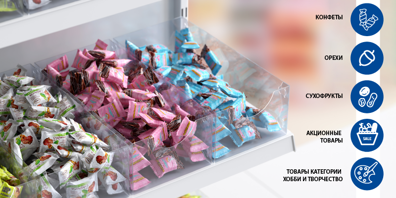 Этот контейнер станет незаменимым помощником в организации продаж на полках стеллажей глубиной 400 и 500 мм, паллетных выкладках и в прикассовых зонах.