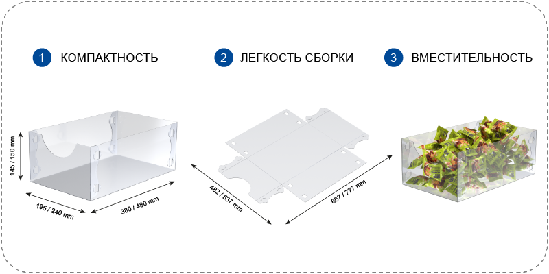 - Удобство и простота: Контейнер легко собирается и разбирается без дополнительных инструментов.