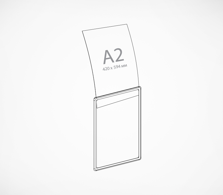 Держатель плаката формата А2 из поликарбоната в виде рамки. Предназначен для обрамления плакатов А2. Способствует сохранности и придает презентабельный вид рекламной информации. Может использоваться с бумажными, картонными, ламинированными плакатами, которые дополнительно могут быть помещены в защитный карман-вкладыш из ПВХ.