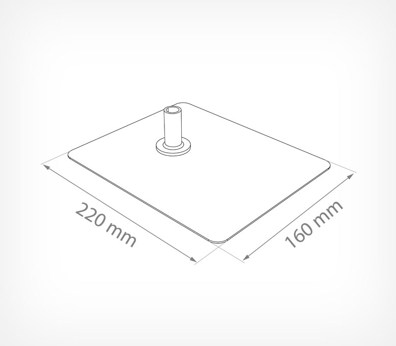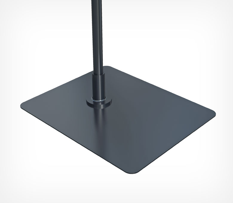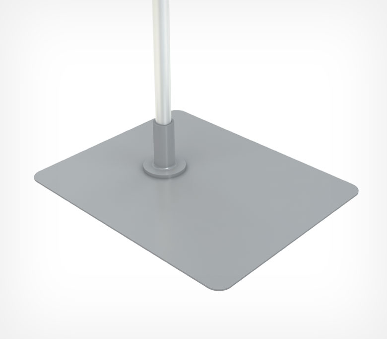 Один из элементов рекламной стойки - металлическая прямоугольная подставка размером 200*160 мм. Используется с телескопическими трубками диаметром 12 мм. Основание из металла позволяет сделать рекламную стойку наибольшей высоты и хорошо удерживать пластиковую рамку даже формата А3. Втулка, в которую вставляется трубка, идет в комплекте с подставкой по умолчанию серого цвета, по запросу клиента возможна комплектация с втулками другого цвета.