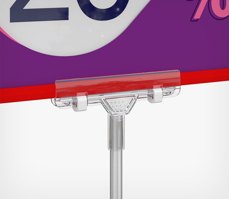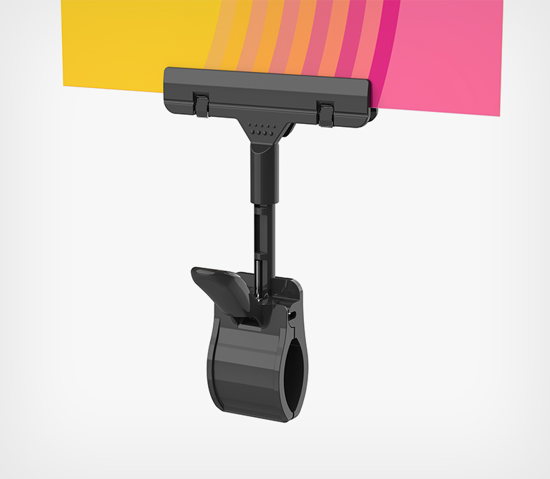 Крепление-зажим для вставок из ламинированной бумаги, картона, пластика толщиной до 6 мм. Позволяет закрепить информацию на алюминиевых трубках 9 мм в диаметре.