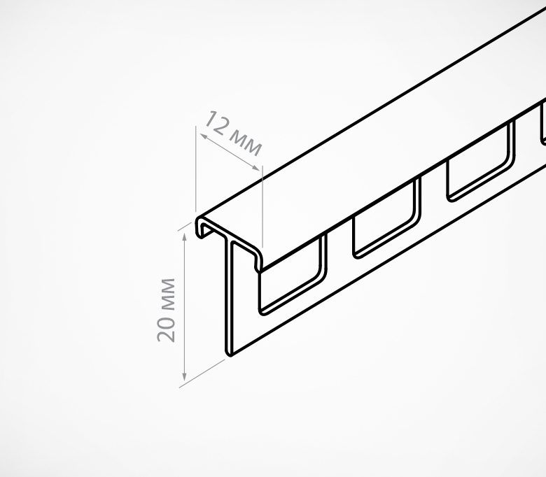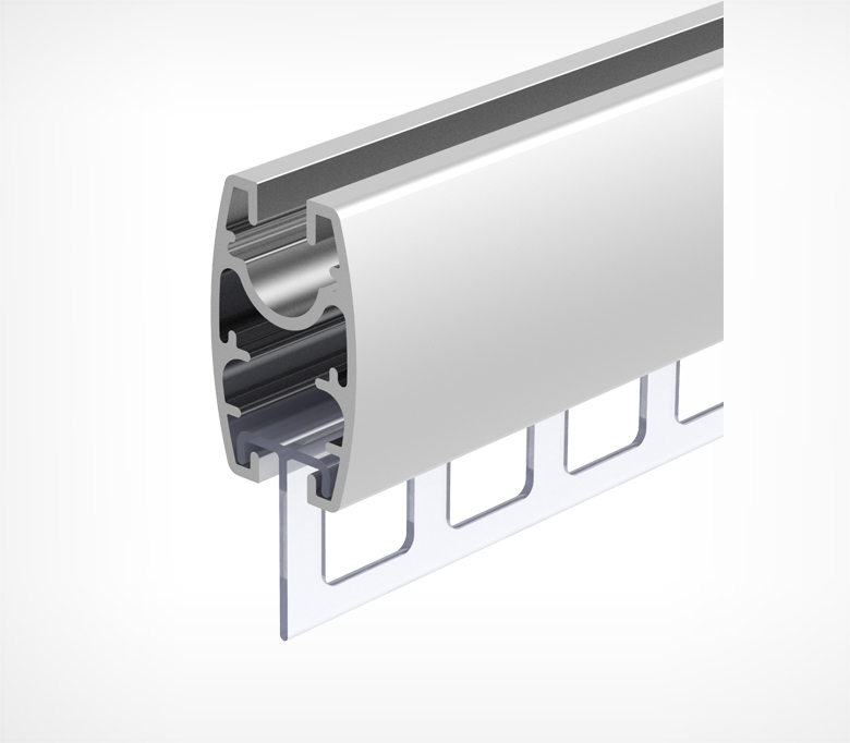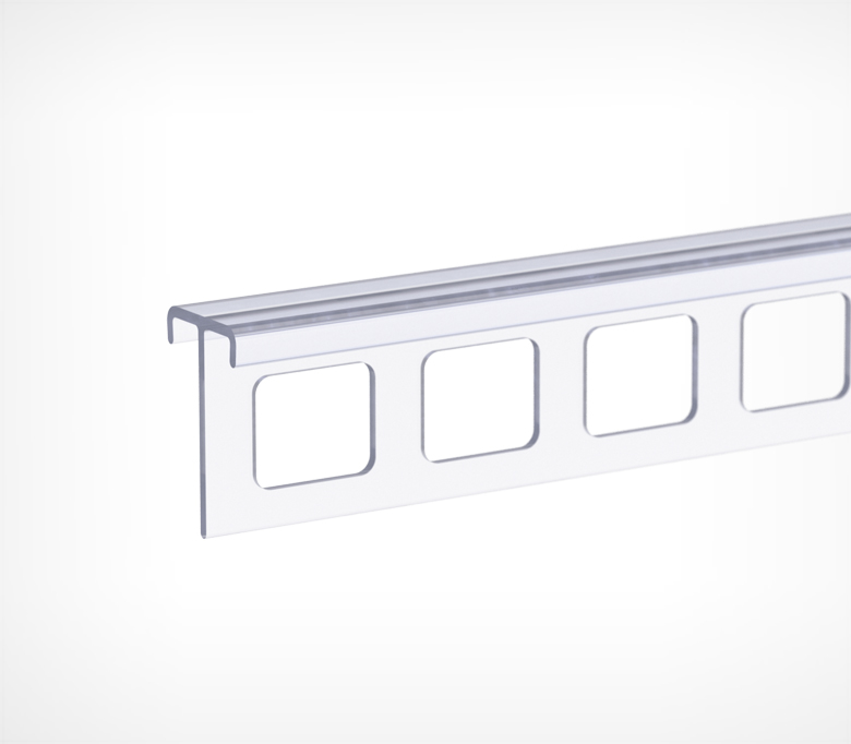 Одним из элементов подвесной системы является пластиковая шина со сквозными отверстиями длиной 1 метр. Она служит для вставки в профиль UniTrack и для размещения на ней рекламных носителей (плакаты, постеры, иные POS-материалы). За перфорацию можно зацепить как пластиковую рамку на крючках, так и карман из ПВХ со встроенными крючками.