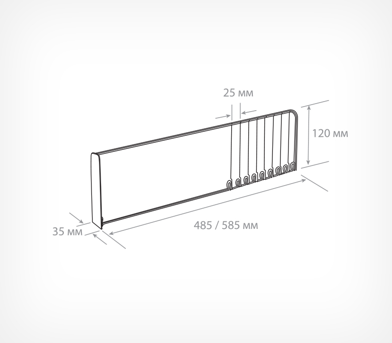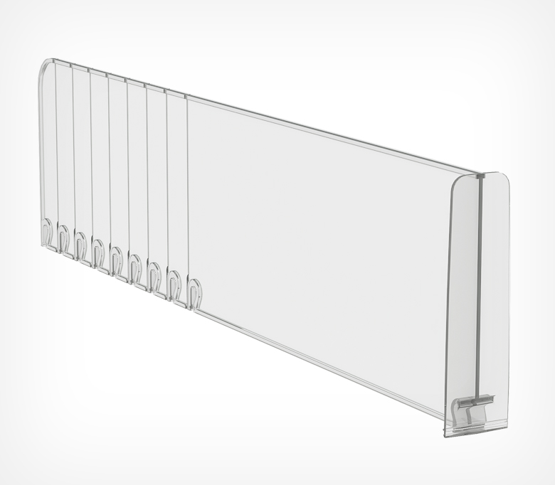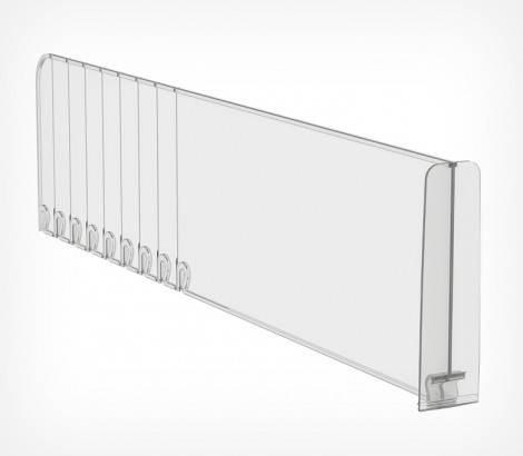 Пластиковый обламывающийся разделитель с передним ограничителем высотой 120 мм. Ограничитель позволяет удерживать товар на полке. Крепится на T-RAIL.