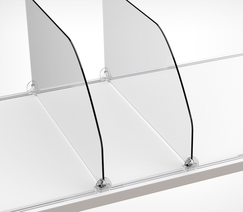 Максимальные по высоте 200 мм разделители используются для зонирования полок, на которых размещаются большие по размеру товары. Три варианта фиксированной длины: 385 мм, 485 мм и 585 мм. Устанавливаются закругленным торцом вперед на усиленный Т-образный профиль на скотче или магните.