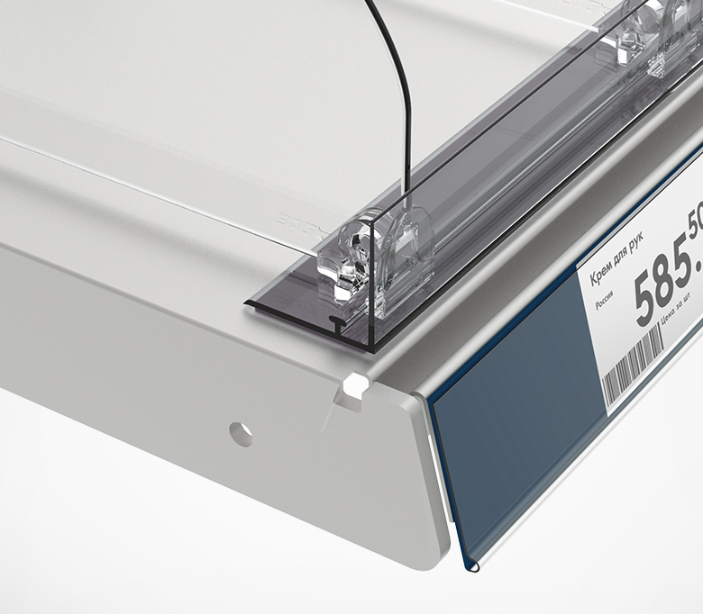 Комплексное решение – L-образный ограничитель товара высотой 30 мм с Т-образным профилем для крепления разделителей к полке. Удобен для формирования выкладки небольших товаров в упаковках, в том числе плоских – колготки, ушные палочки, шоколадные плитки и т.д. На выбор предлагается крепление профилей на скотч или магнит.
