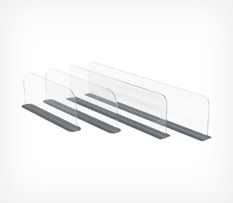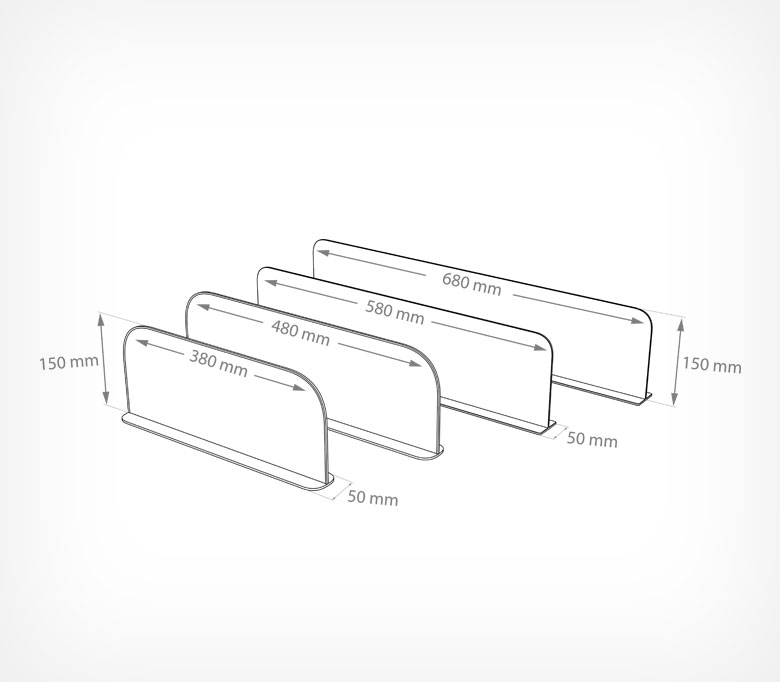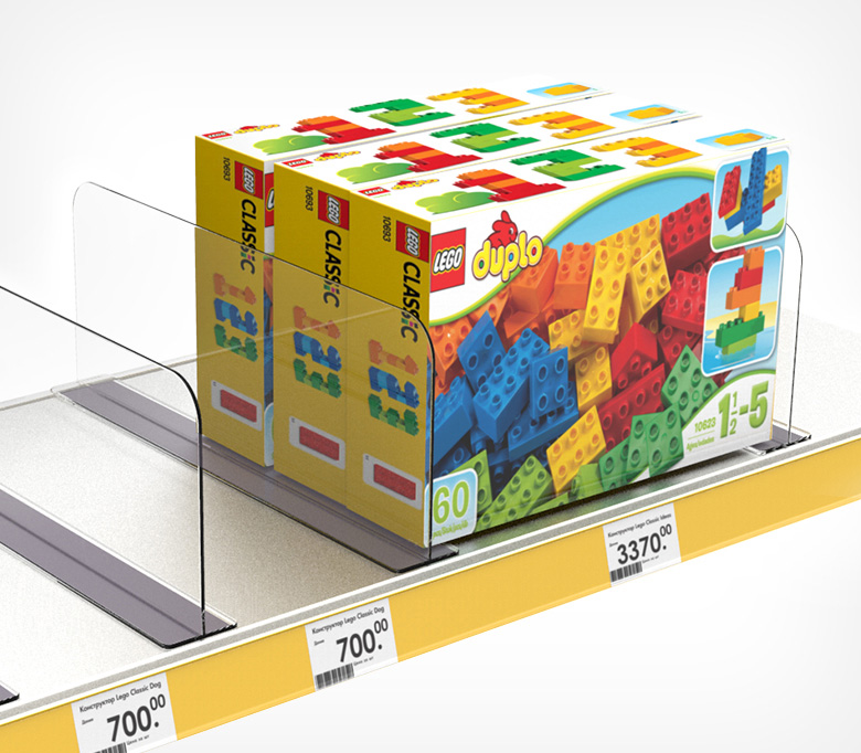 Т-образный разделитель товара высотой 150 мм из ударопрочного пластика легко устанавливается на металлические полки без дополнительных профилей. Фиксация происходит за счет магнита, который нанесен на Т-основание шириной 50 мм. Удобен в использовании, быстро переставляется в нужное место.