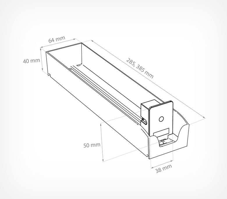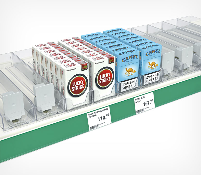 Идеальная конструкция для презентации сигарет. Дает возможность дотягиваться до конкретной пачки, которые выставлены предварительно в ряд. Длина толкателя может варьироваться, в зависимости от запроса клиента. Также подбираются разные по силе срабатывания пружины, от 3 од 12 Ньютонов.