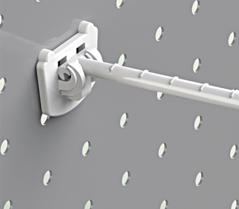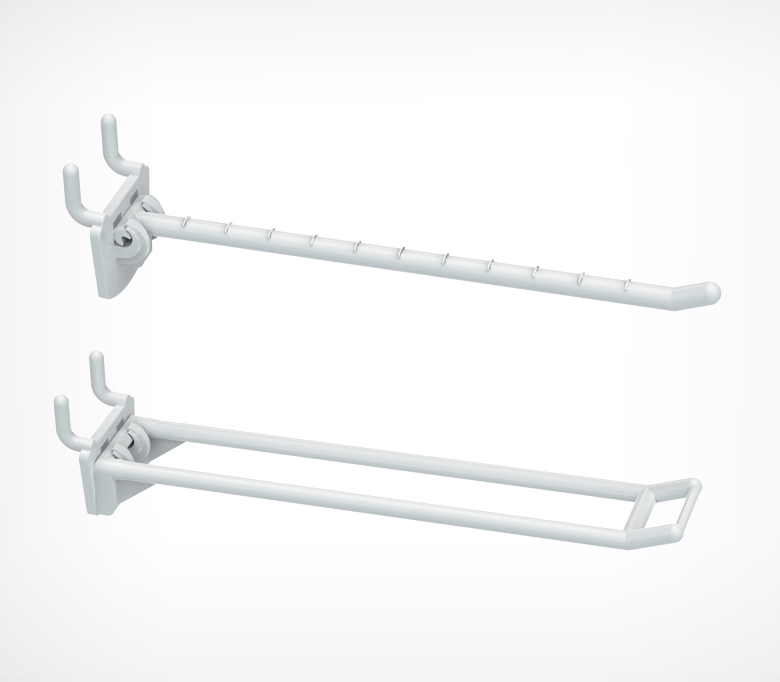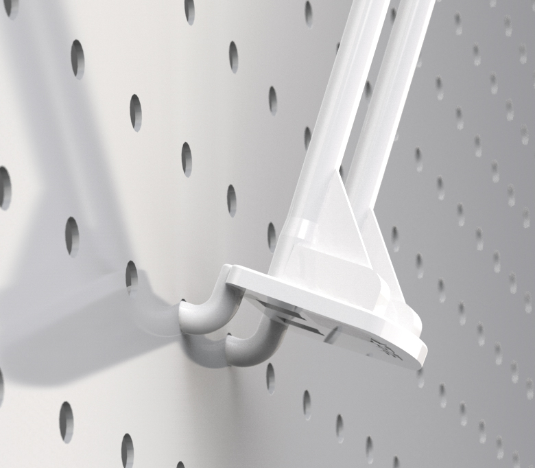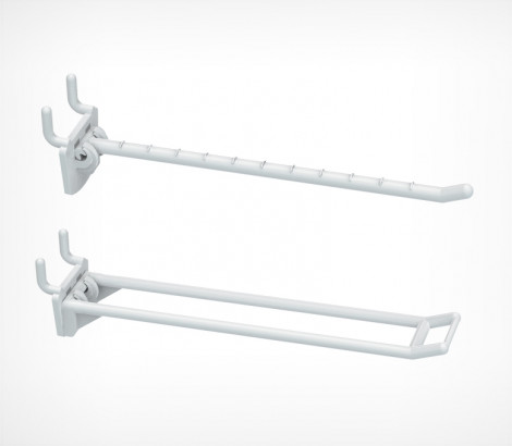Пластиковые крючки HOOK-MP предназначены для установки в перфорированные панели толщиной 1-2 мм с шагом 25 мм и диаметром отверстия 4,6 мм. Дополнительно имеют ребра жесткости, изготовлены из прочного пластика, выдерживают значительный вес. Каждый из видов представлен 3-мя длинами: 100, 150 и 200 мм.